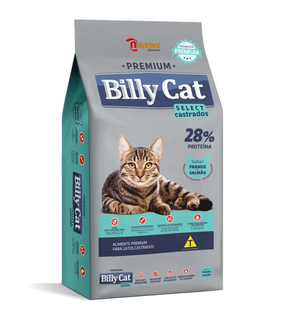 Billy Cat Select Castrados e um alimento completo e balanceado, com ingredientes de alta digestibilidade, trazendo em sua composição todos os nutrientes indispensáveis para o desenvolvimento do seu gato. Billy Cat Select Castrados possui níveis adequados de gorduras, proteínas, vitaminas, fibras, minerais, adição de taurina (aminoácido essencial à dieta), teor de magnésio equilibrado e componentes que equilibram o PH da urina, prevenindo contra a obstrução do trato urinário.
